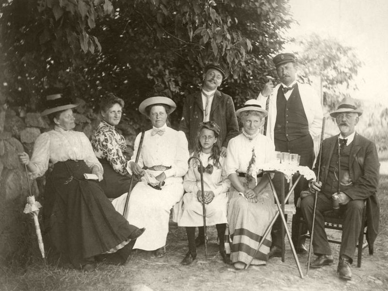 I 1908, da Frøken Jensen (t.v.) fyldte 50, inviterede hun sin principal, skolebestyrer Jørgen Melchior (t.h.) til Bornholm. Bagest (i kittel) hotelværten på Jantzens Hotel i Gudhjem.