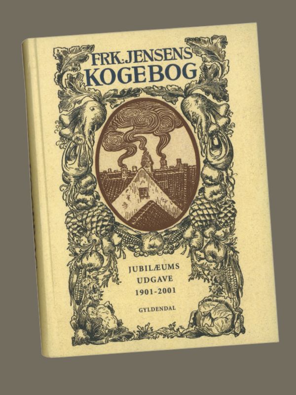 Genoptryk af den første forside på Frøken Jensens Kogebog i anledning af bogens 100-års jubilæum.